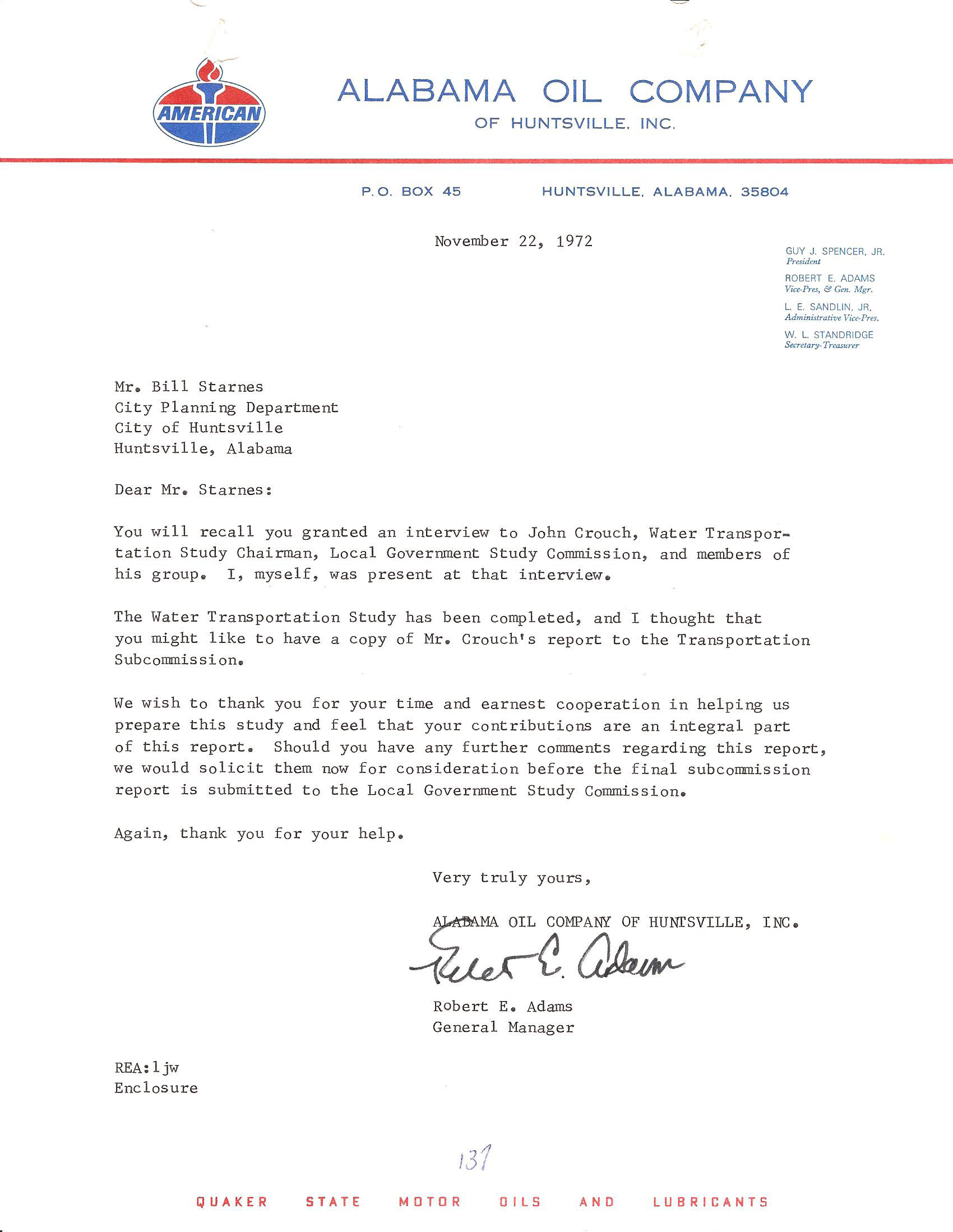 Letter to the City Planning Department from Robert E. Adams, General Manager of the Alabama Oil Company of Huntsville, Inc.Source: Robert E. Adams, General Manager, Alabama Oil Company of Huntsville, Inc.