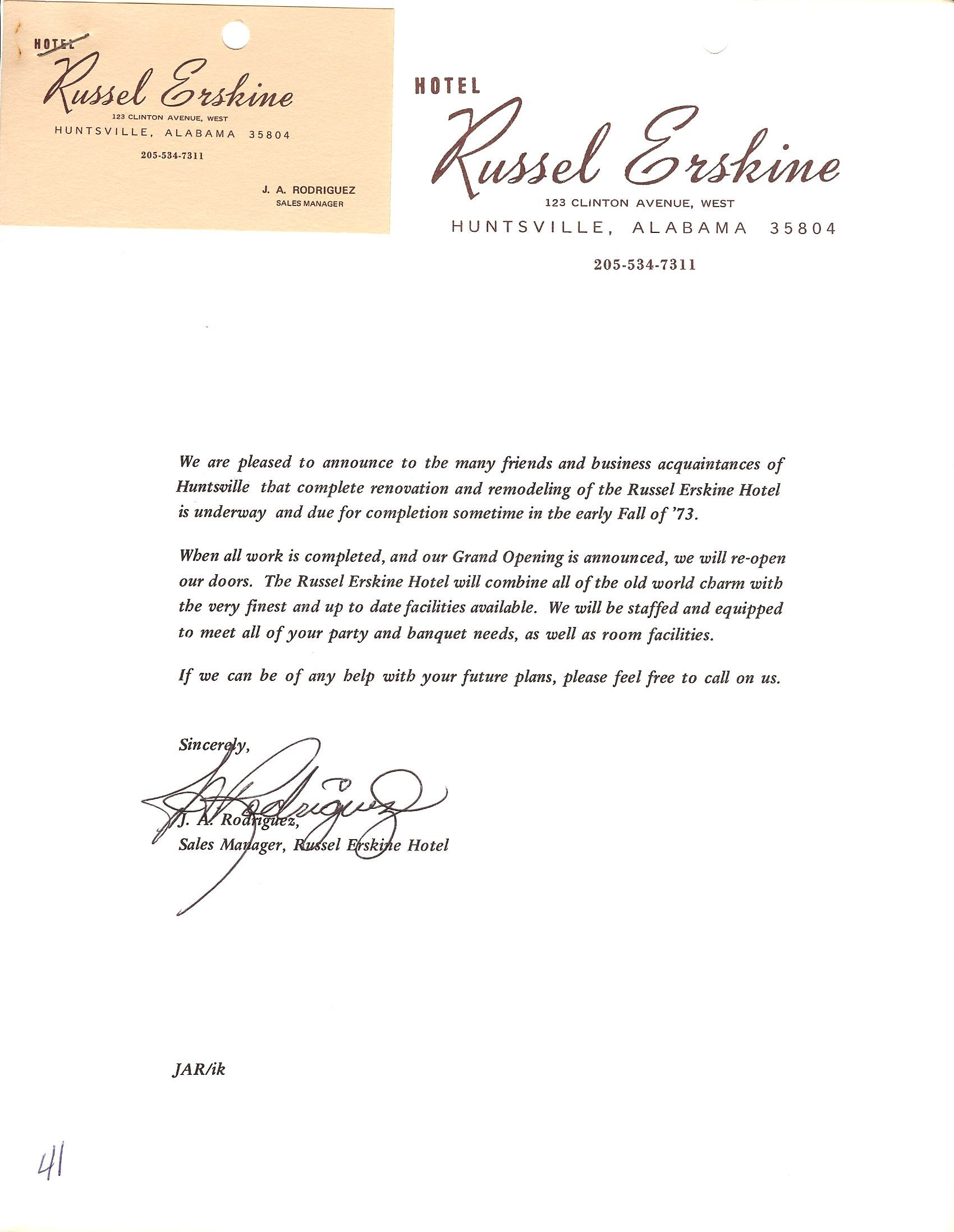 A general letter from J. A. Rodriguez, Sales Manager, Russel Erskine Hotel, announcing that complete renovation and remodeling of the Russel Erskine Hotel is underway and due for completion sometime in the early Fall of '73.Source: J. A. Rodriguez, Sales Manager, Russel Erskine Hotel